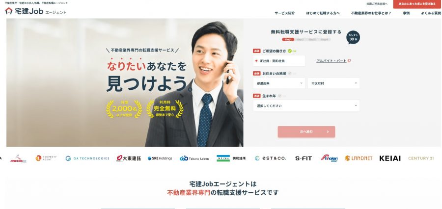 宅建Jobエージェントは不動産業界専門の転職支援サービスです。月間2,000名以上が登録しているので信頼度も高めです。おもに取り扱う職種には、売買仲介・販売営業・賃貸営業・不動産管理・事務・仕入れ・開発などに強みを持っています。全国の求人に対応しており、地域密着型の中小企業から大企業まで取りそろえているので、自分に合った職場が見つかる可能性が高いです。